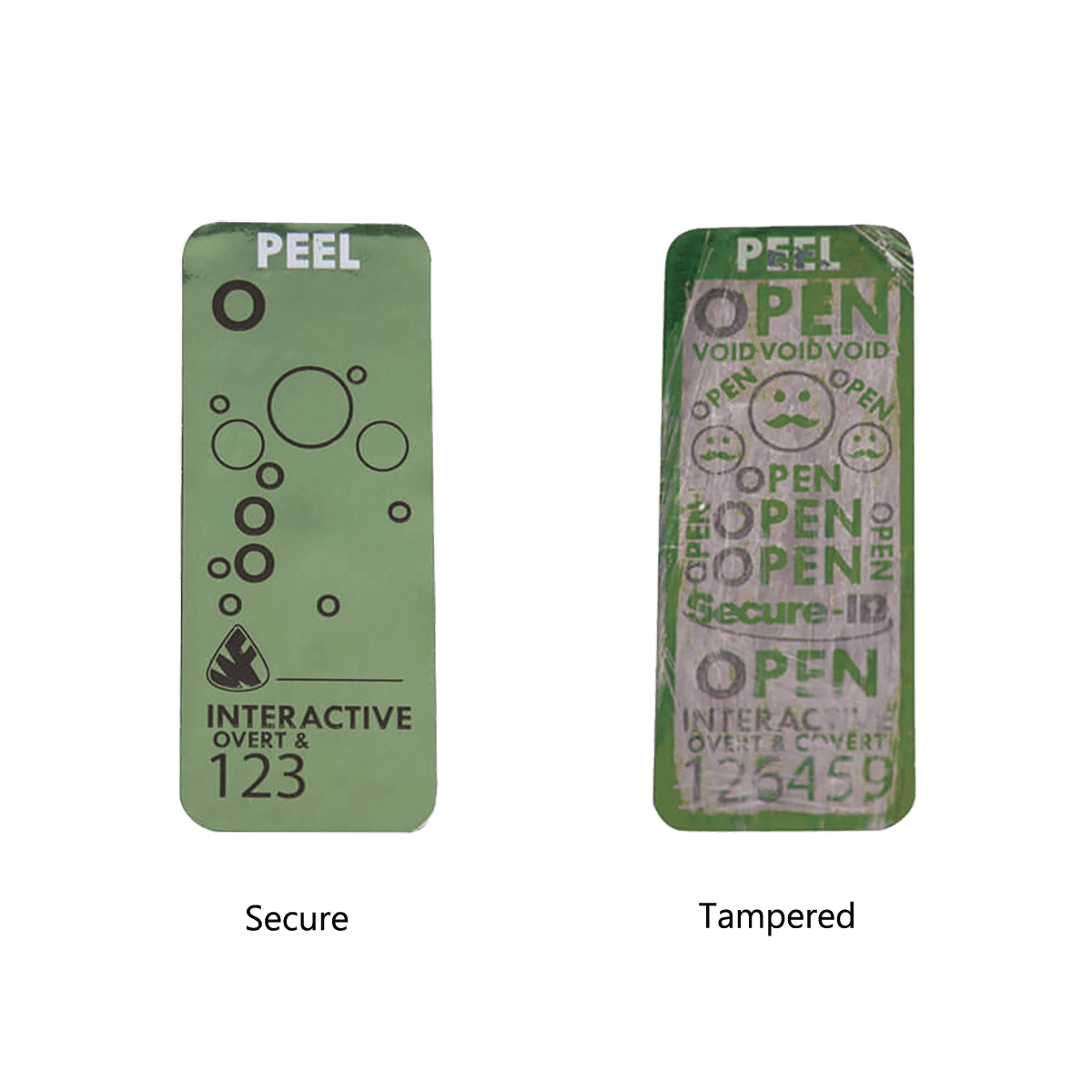 Made from a specially layered film consisting of aluminum, polyester, and a patented optical film, these tamper evident labels are nearly impossible to defeat. Upon tampering, color disappears and hidden message will be permanently revealed.