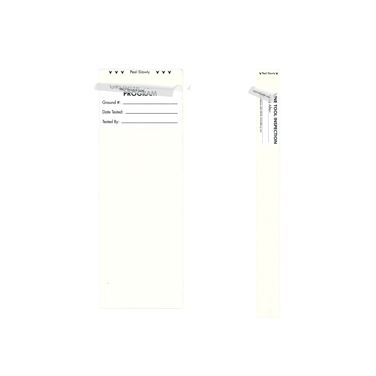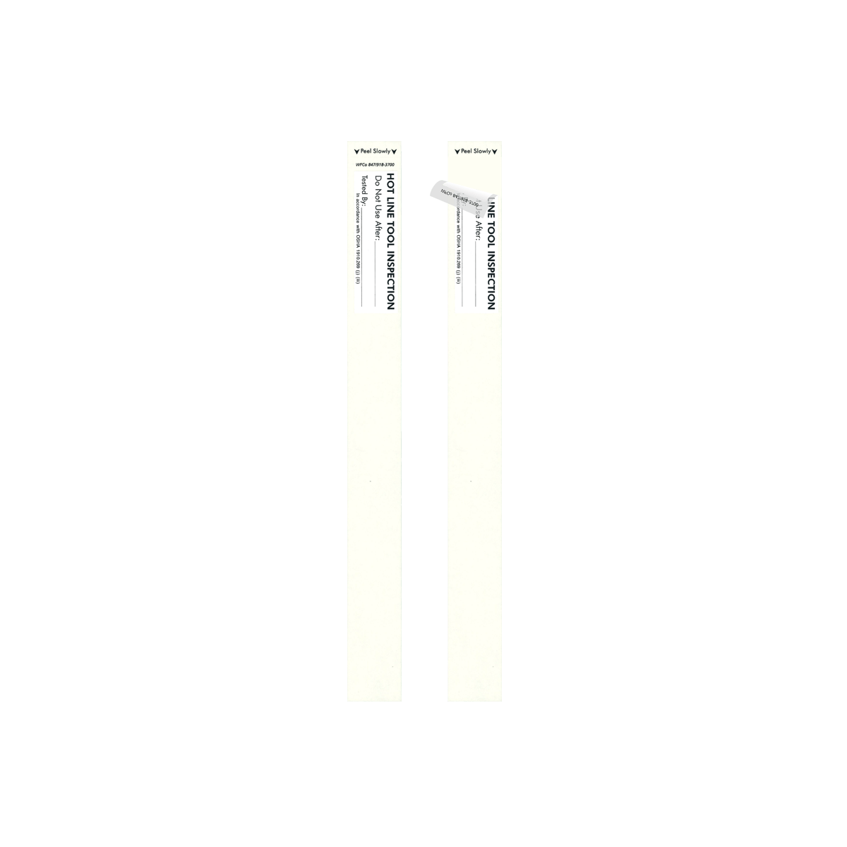 William Frick & Company Grounds Testing and Hot Stick Inspection Labels arrive custom printed with your company logo, serialized numbers and barcodes. When attached to electrical tools such as hot line sticks or grounding sticks, these inspection labels provide a white area where you can write in information, and a clear “tail” that wraps over and around to seal and protect your data. This construction makes the labels perfect for recording information such as the date a tool was inspected, who tested it, the expiration date, and other relevant information. Helps document compliance with OSHA regulations for inspecting electrical protection tools.